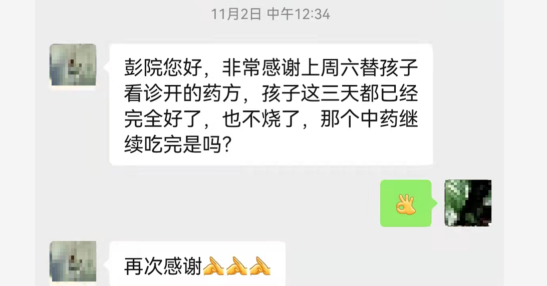 近日,珠海李女士(化名)给彭康教授发来这样一段微信,“非常感谢上周六替孩子看诊开的药方,孩子这三天都已经完全好了,也不烧了。”原来该患儿(12岁)前几日发热、夜间突然晕厥,家人送至住院治疗,一直发烧不退,在义诊现场请彭康教授会诊。