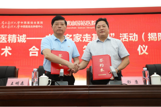 6月19日上午,“大医精诚-中医名家走基层”活动(揭阳站)第二场活动在潮汕国裕医院举行。南方医科大学中西医结合医院与潮汕国裕医院签订了技术协作医院协议并举行挂牌仪式。南方医科大学中西医结合医院彭康副院长、揭阳市卫生健康局中医科科长袁杰群、国裕大健康集团董事长袁赵伟、潮汕国裕医院院长王明森等领导、嘉宾出席了活动。