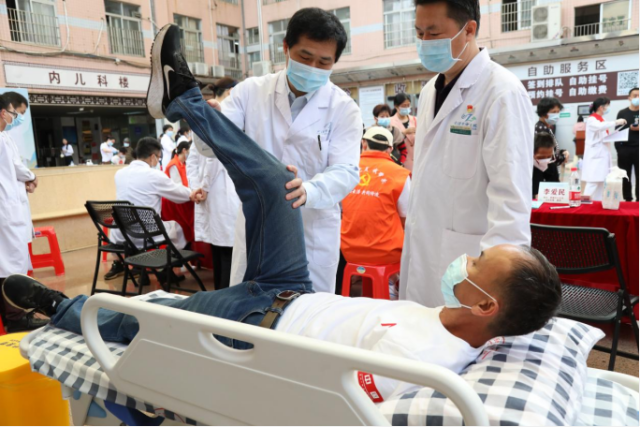 南方医科大学中西医结合医院神经外科主任陈陆馗教授为腿麻患者做检查。