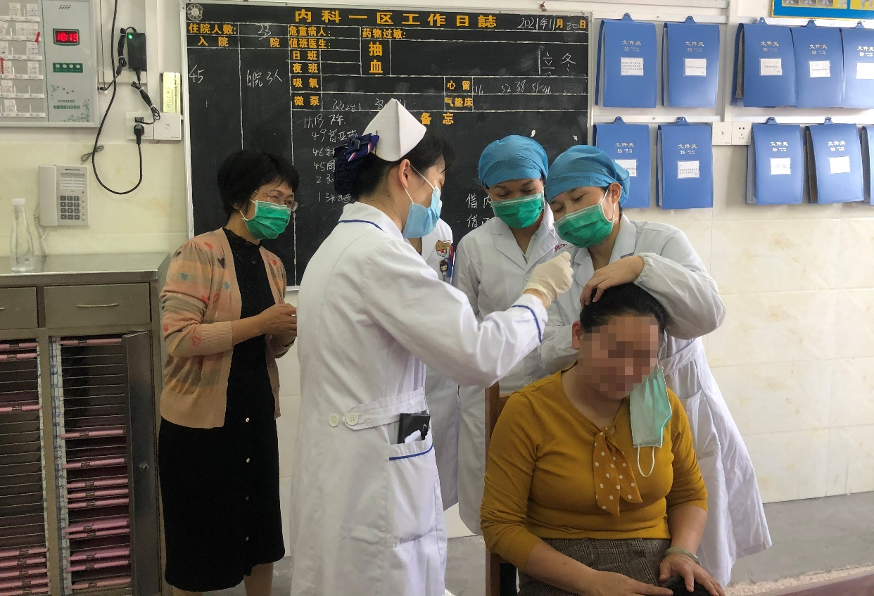心血管病科护理单元护师冷丹丹给护理工作人员展示为病人进行耳尖放血、耳穴贴豆等中医特色护理