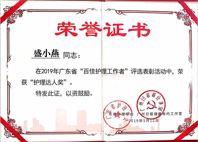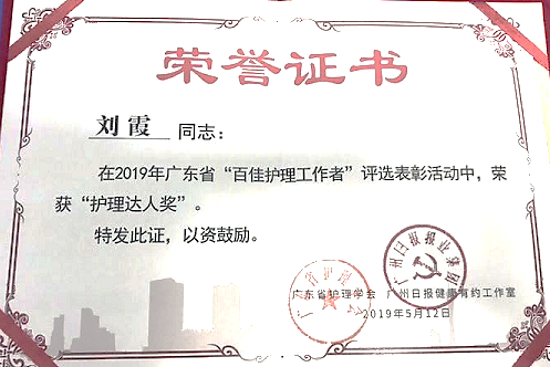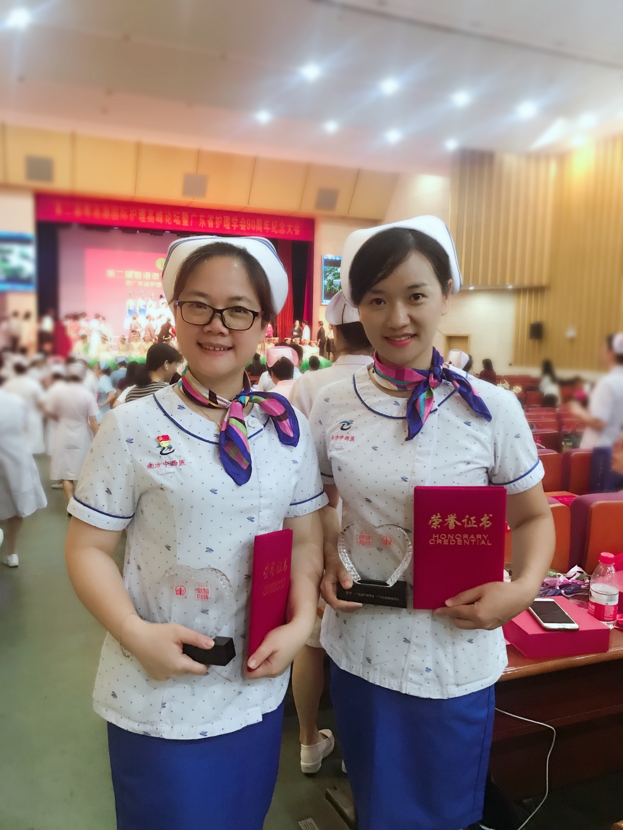 我院护理部盛小燕、综合病区刘霞5.12国际护士节前夕参加广东省护理学会与广州日报联合主办的2019“百佳护理工作者”评选表彰活动,于2019年4月29日至5月7日分别以“十佳护理科技工作者奖”及“双十佳仁心妙手护士大奖”参加网络评选,最终两人均获得“护理达人”奖,并于5.12当天参加表彰大会。