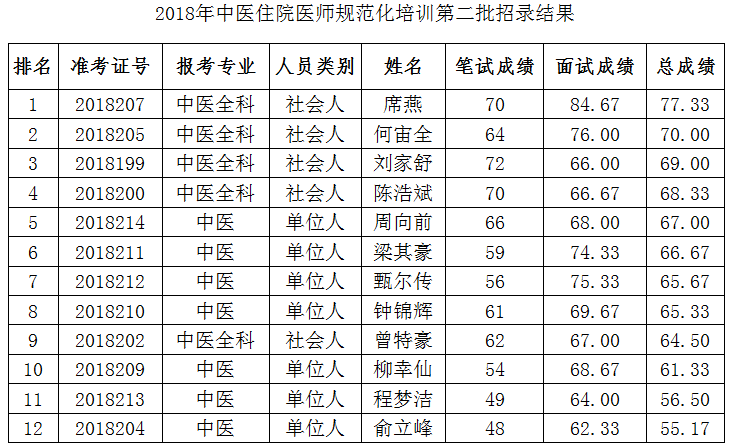 2018年中医住院医师规范化培训第二批招录结果