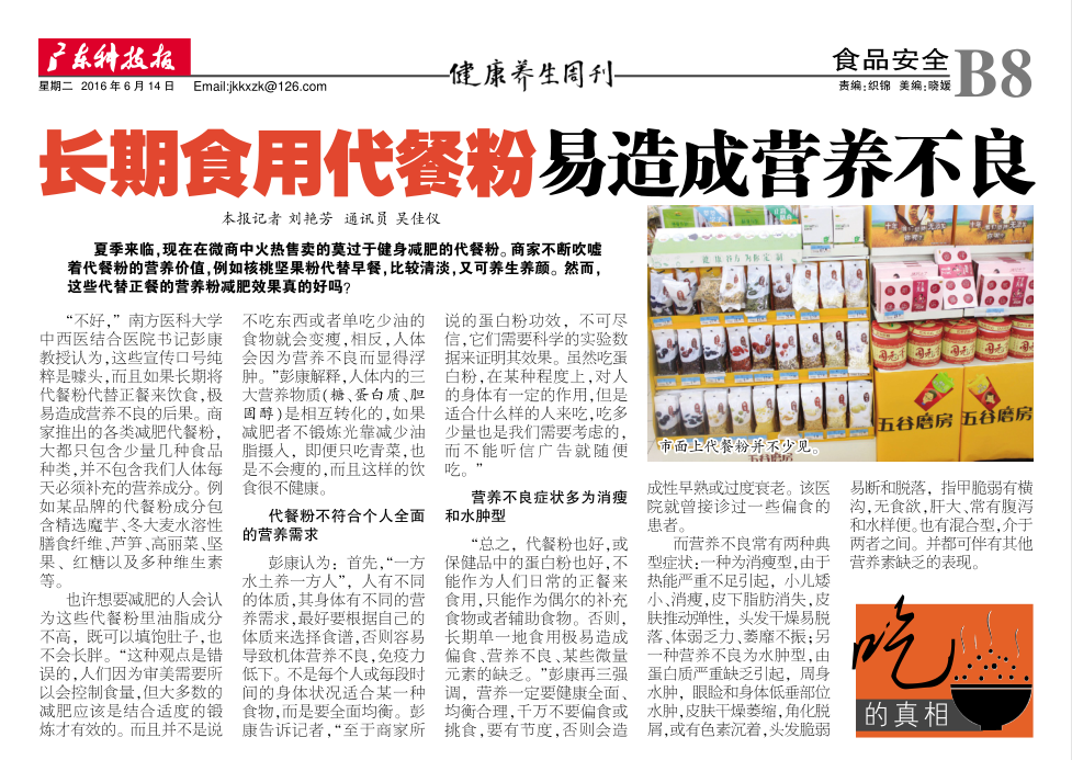 “总之,代餐粉也好,或保健品中的蛋白粉也好,不能作为人们日常的正餐来食用,只能作为偶尔的补充食物或者辅助食物。否则,长期单一地食用极易造成偏食、营养不良、某些微量元素的缺乏。”彭康再三强调,营养一定要健康全面、均衡合理,千万不要偏食或挑食,要有节度,否则会造成性早熟或过度衰老。该医院就曾接诊过一些偏食的患者。