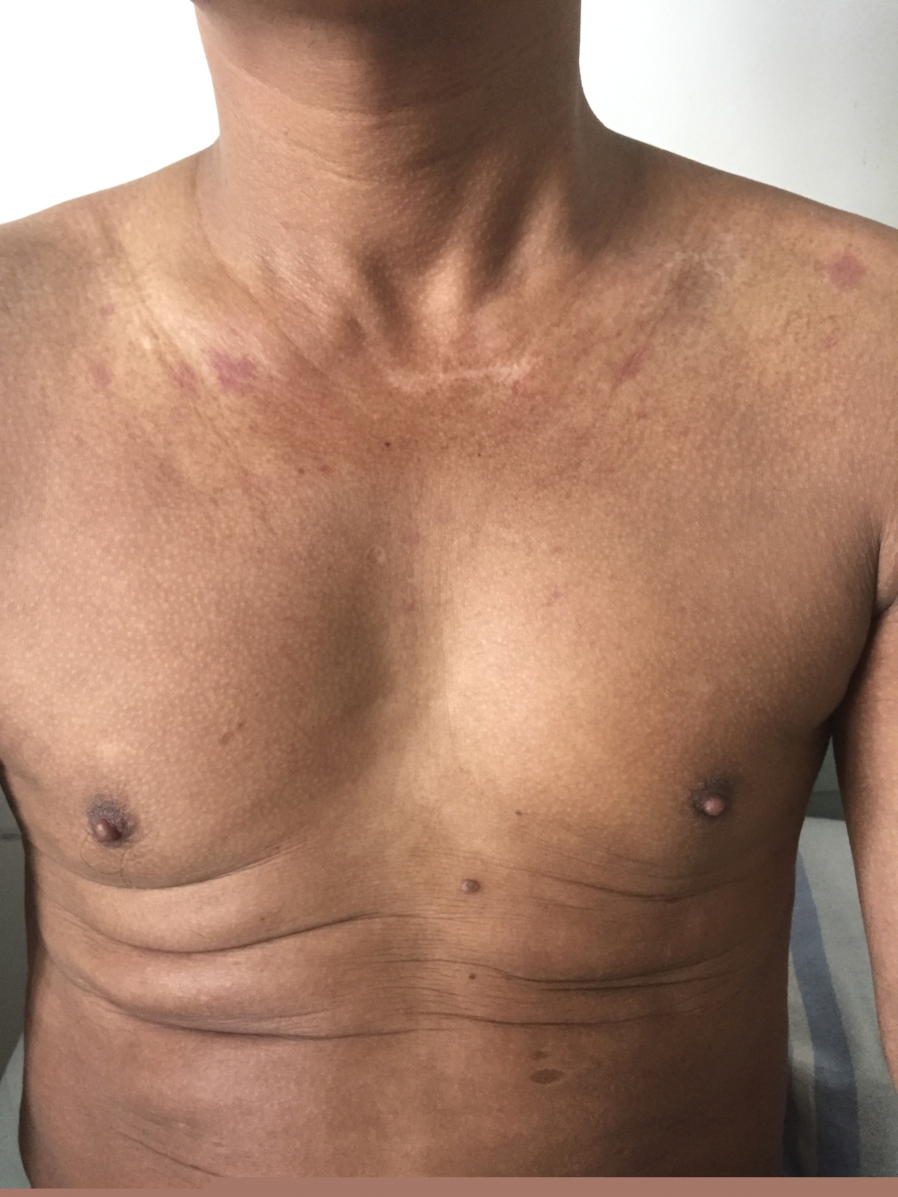 谭某:治疗3月后,胸腹部皮肤厚度恢复正常,弹性明显改善。