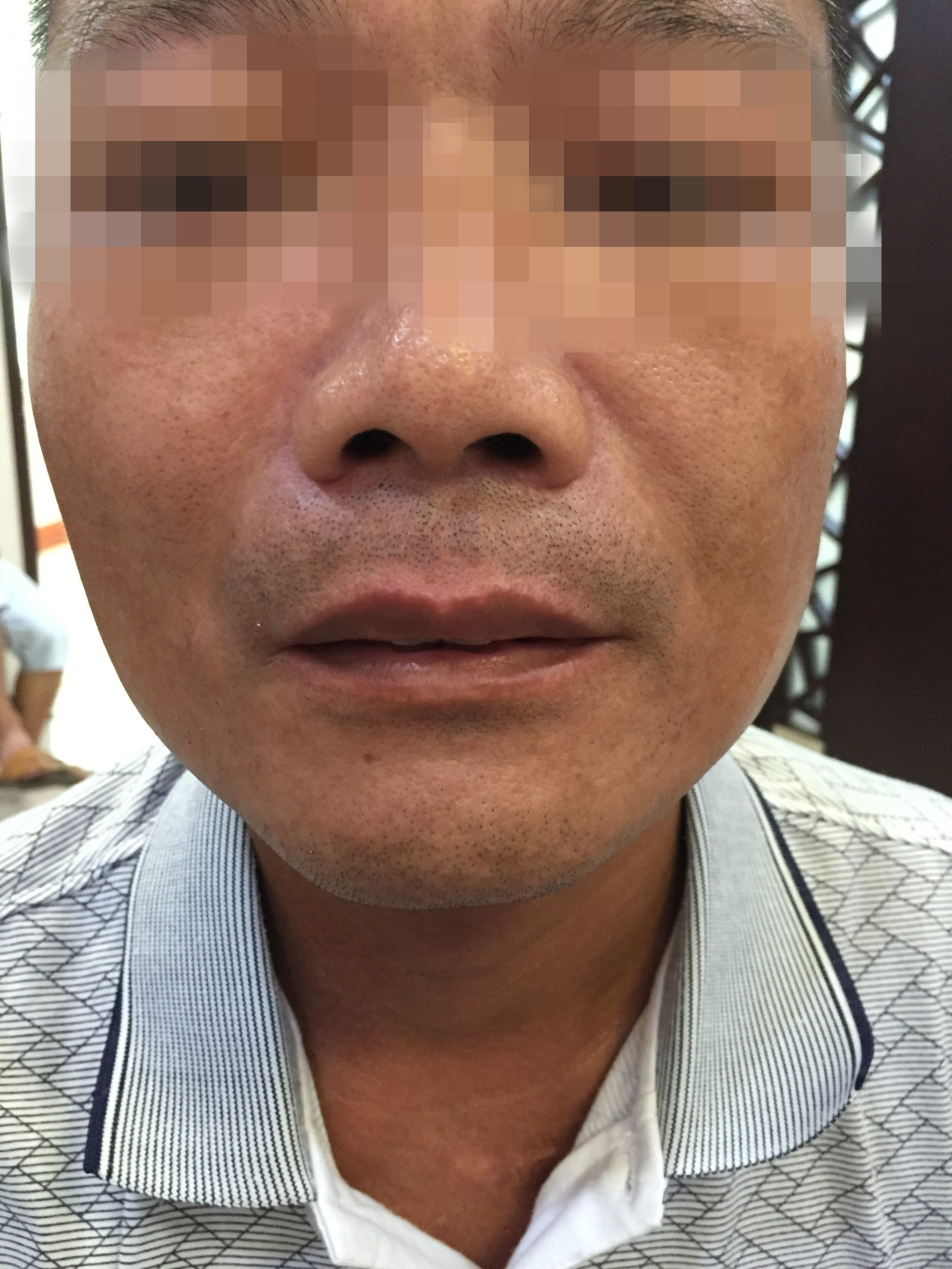 谭某:治疗前,面部皮肤变硬增厚,表情僵硬。