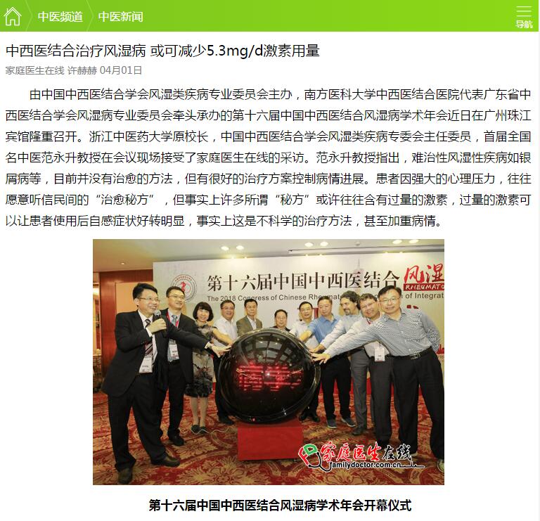 由中国中西医结合学会风湿类疾病专业委员会主办,南方医科大学中西医结合医院代表广东省中西医结合学会风湿病专业委员会牵头承办的第十六届中国中西医结合风湿病学术年会近日在广州珠江宾馆隆重召开。浙江中医药大学原校长,中国中西医结合学会风湿类疾病专委会主任委员,首届全国名中医范永升教授在会议现场接受了家庭医生在线的采访。范永升教授指出,难治性风湿性疾病如银屑病等,目前并没有治愈的方法,但有很好的治疗方案控制病情进展。患者因强大的心理压力,往往愿意听信民间的“治愈秘方”,但事实上许多所谓“秘方”或许往往含有过量的激素,过量的激素可以让患者使用后自感症状好转明显,事实上这是不科学的治疗方法,甚至加重病情。