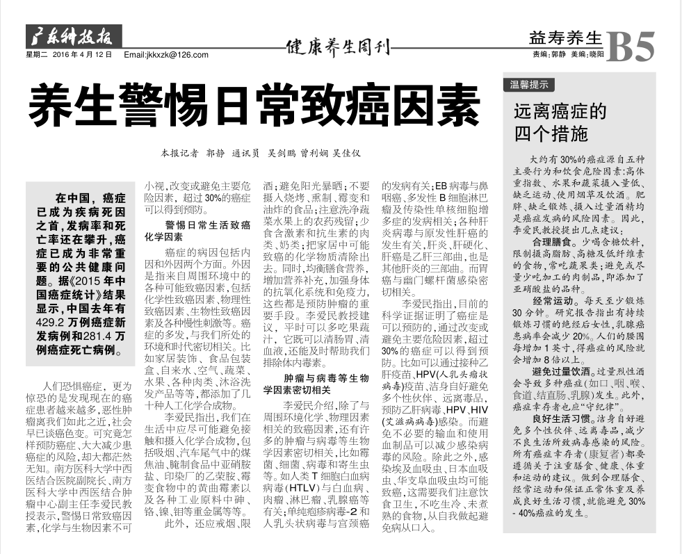人们恐惧癌症,更为惊恐的是发现现在的癌症患者越来越多,恶性肿瘤离我们如此之近,社会早已谈癌色变。可究竟怎样预防癌症、大大减少患癌症的风险,却大都茫然无知。南方医科大学中西医结合医院副院长、南方医科大学中西医结合肿瘤中心副主任李爱民教授表示,警惕日常致癌因素,化学与生物因素不可小视,改变或避免主要危险因素,超过30%的癌症可以得到预防。