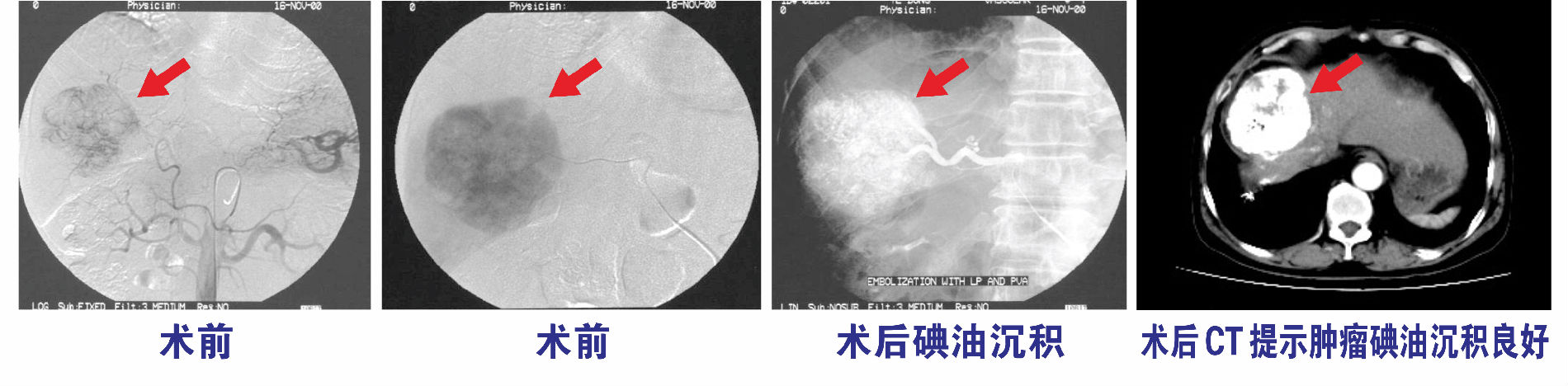 1. 原发性肝癌动脉化疗/栓塞术(TACE术),(红色箭头所指为肿瘤部位)