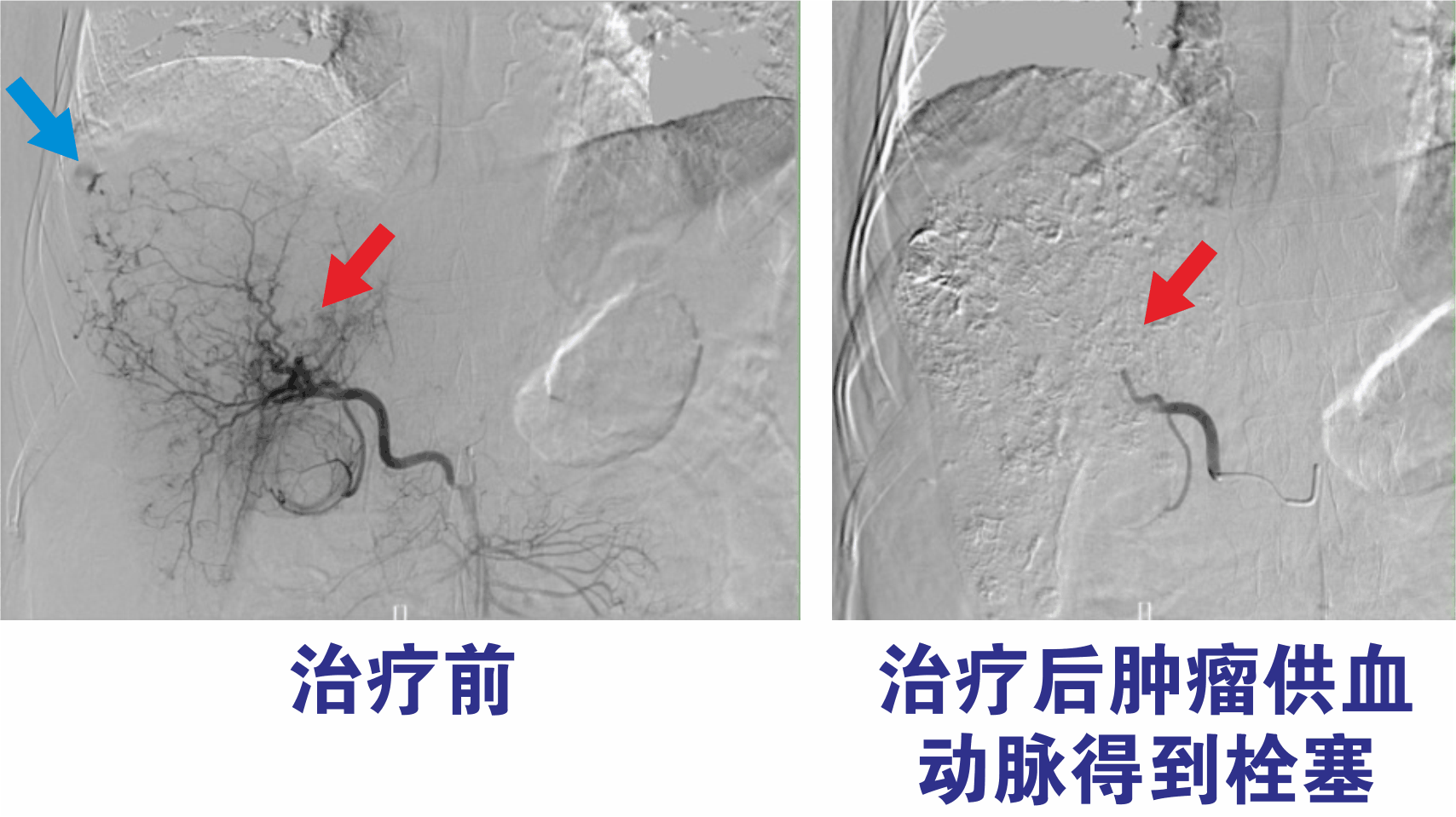 2. 原发性肝癌破裂出血的治疗(蓝色箭头所指之处有造影剂外渗的征象,为出血点。红色箭头所指是肿瘤染色,肿瘤破裂并出血,予同时行TACE治疗)