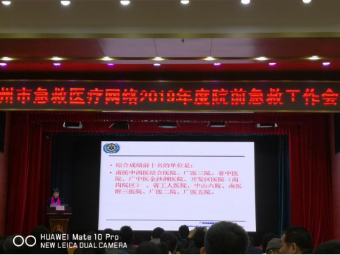 广州市急救医疗指挥中心(120中心)于2020年1月19日下午在广州市东山宾馆召开2019年下半年暨年度院前急救工作会议。会议由广州市急救医疗指挥中心张勇副主任主持,广州市卫计委医政处程泽飞副处长到会并对2019年度广州市院前急救工作作出相关总结及指导性意见的讲话,广州市急救医疗指挥中心副主任曾睿作《关于2019年下半年院前急救工作考核的通报》报告和 《2019年度院前急救工作总结及2020年主要工作安排》报告,其中在《关于2019年下半年院前急救工作考核的通报》报告中,总结主要成绩时,通报了全市66间120网络医院综合成绩前十名的单位,其中我院急诊科名列第一名。