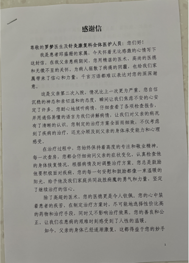 近日,南方医科大学中西医结合医院针灸康复科收到了一封来自患者邱先生(化名)的感谢信,信中满溢着对针灸康复科全体医护人员的诚挚感激与高度赞扬。