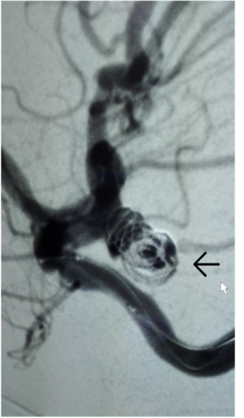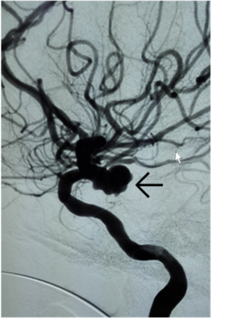 女性,63岁,蛛网膜下腔出血,后交通动脉瘤破裂出血,动脉瘤大,易再出血,死亡率达60%以上。行血管内动脉瘤栓塞术,手术安全、创伤小、效果好,避免再出血风险。