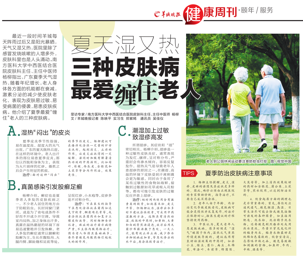 最近一段时间羊城每天阵雨过后又是阳光暴晒,天气又湿又热,医院里除了感冒发烧咳嗽的人增多外,皮肤科里也是人头涌动。南方医科大学中西医结合医院皮肤科主任、主任中医师杨柳指出,广东夏季天气湿热,随着年纪增长,老人身体各方面的机能都在衰减,激素分泌的减少使皮肤老化,表现为皮肤易过敏、易受病菌的侵袭,易患皮肤疾病。他介绍了夏季最爱“缠住”老人的三种皮肤病。
