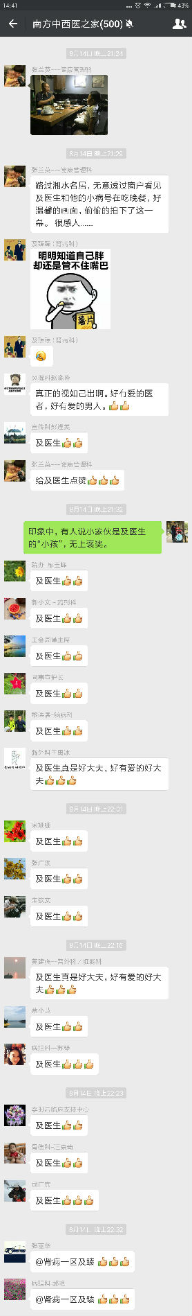 2017年8月14日晚,南方医科大学中西医结合医院微信群内,健康管理中心护士长张兰英发出这样一段话:路过湘水名居,无意透过窗户看见及医生和他的小病号在吃晚餐,好温馨的画面,隔着玻璃墙偷偷拍下了这一幕。很感人……
