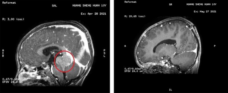 方案敲定并完善相关术前检查后,4月28日为小乐进行“右侧脑室穿刺引流术”,术后小乐头晕、呕吐症状明显缓解;4月30日在全麻下进行“后正中入路第三脑室及松果体区巨大肿瘤切除术”,手术顺利完成。术后病理结果为生殖细胞瘤。目前,小乐已接受放疗和化疗,恢复良好。