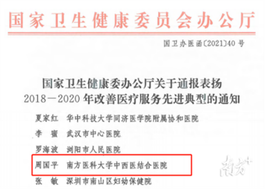 近日,国家卫生健康委办公厅、国家中医药管理局先后发布《关于通报表扬2018-2020年改善医疗服务先进典型的通知》、《关于通报表扬中医药系统2018-2020年改善医疗服务先进典型的通知》,南方医科大学中西医结合医院针推康复科荣获全国中医药系统改善医疗服务临床路径管理先进典型科室,该科周国平主任荣获全国卫生健康系统、全国中医药系统改善医疗服务临床路径管理制度先进典型个人。