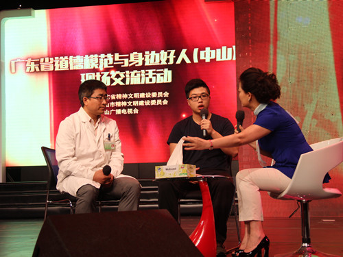 4月29日上午,2014年第四季度广东省道德模范和身边好人现场交流活动在中山市中山广播电视台演播大厅进行,来自全省的19名广东好人及亲属代表参加活动,现场共有8名广东好人的先进事迹作了播映和现场交流,被评为“广东好人”的南方医科大学中西医结合医院急诊科贺运河主任受到邀请,由于本人骨髓移植术后尚在恢复期不便出席,由其儿子贺翊峰和急诊科同事曲宏达副主任代表出席了交流活动,在与主持人的互动交流中,主持人及在场观众多次被贺主任的事迹感动落泪。现场交流会上,中西医结合医院还为中山市奋不顾身救人的被评为2014年度“中山好人”的翁强枝船长等人赠送了他们急需的一些常用药品和保健品。