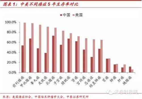 十年来中国癌症发病率呈上升趋势,市场前景巨大。中国国家卫生计生委发布的《中国居民营养与慢性病状况报告(2015年)》显示,十年来中国癌症发病率呈上升趋势,其中肺癌和乳腺癌分别位居男、女性发病首位。而根据2013年美国癌症协会与2013年全国临床肿瘤学大会的统计数据,中美在癌症五年整体存活率上有着显著差距:美国总体的5年癌症生存率是66%,而中国总体的癌症生存率是31%。我国癌症预防和治疗市场空间巨大。