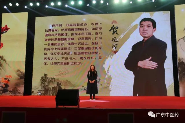 ▲在2月28日举办的“弘扬大医精诚 践行核心价值”广东中医药先进典型人物事迹报告会上,贺主任因身体不适,未能出席,他的妻子到场,代他接受了我们的致敬。