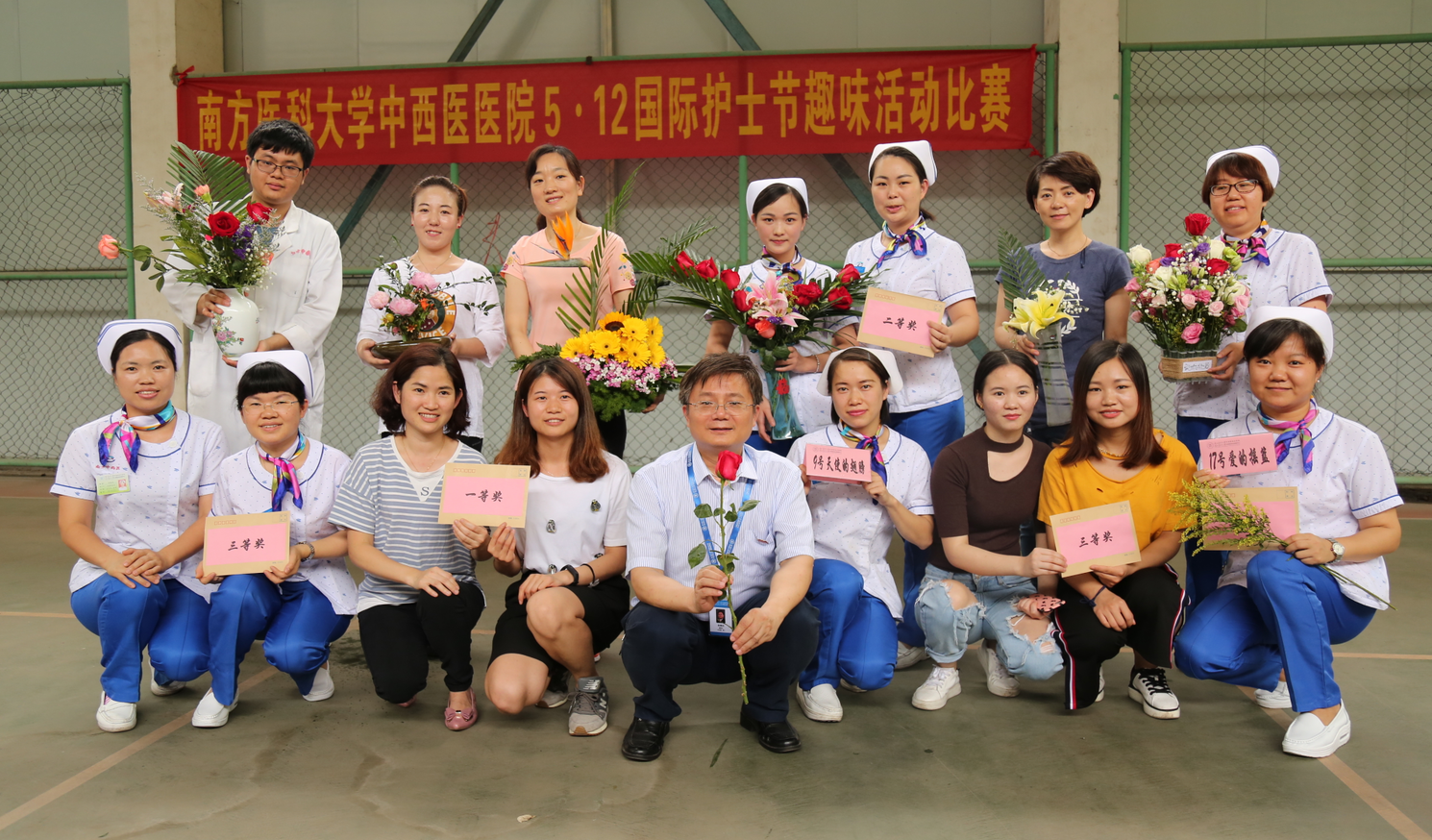 由护理部、宣传科、工会共同举办的插花比赛5月12日下午在灯光球场拉开序幕,李爱民副院长(主持行政工作)在致辞中向辛勤工作的护理人员致以节日的问候,希望大家在快乐中工作,能获得越来越多的幸福感。随后,李爱民副院长、朱晓光副院长为医院护理实习生们赠送玫瑰花,热烈欢迎他们到我院实习。