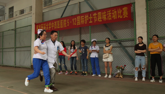 为了增强我院医护人员团结协作精神,提高团队意识及凝聚力,5月12日下午在灯光球场举行两人三足接力跑步比赛。此次比赛由各科室主任、专家教授、医师与护士长、护士们组合而成,各参赛队伍人员分成5小组,每小组2人团结协作,两人并排站立,一人左腿与另一人右腿的膝盖以下,脚踝以上部分用绳子绑上,一起通过长25米的赛道,然后将接力棒交给下一组参赛选手,直至5组参赛人员跑完。