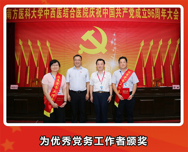 大会在雄伟庄严的国歌声中拉开了帷幕。彭康常务副书记宣读了南方医科大学中西医结合医院《关于表彰2017年度优秀共产党员、优秀党务工作者和先进基层党组织的通报》,授予魏朝艳等32名共产党员“优秀共产党员”称号,授予彭康、皮玲两名同志“优秀党务工作者” 称号,授予机关第三党支部、医辅第一党支部、临床第一党支部3个党支部 “先进基层党组织”称号。之后院领导们分别为获得表彰的集体代表和个人颁发了奖牌和荣誉证书。
