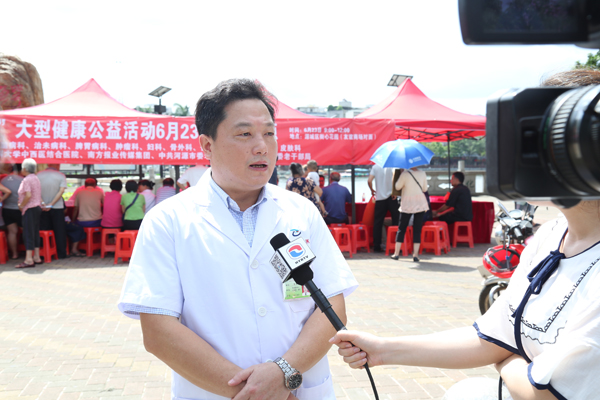 医院常务副书记彭康教授(右一)亲自带队在现场为百姓健康把脉