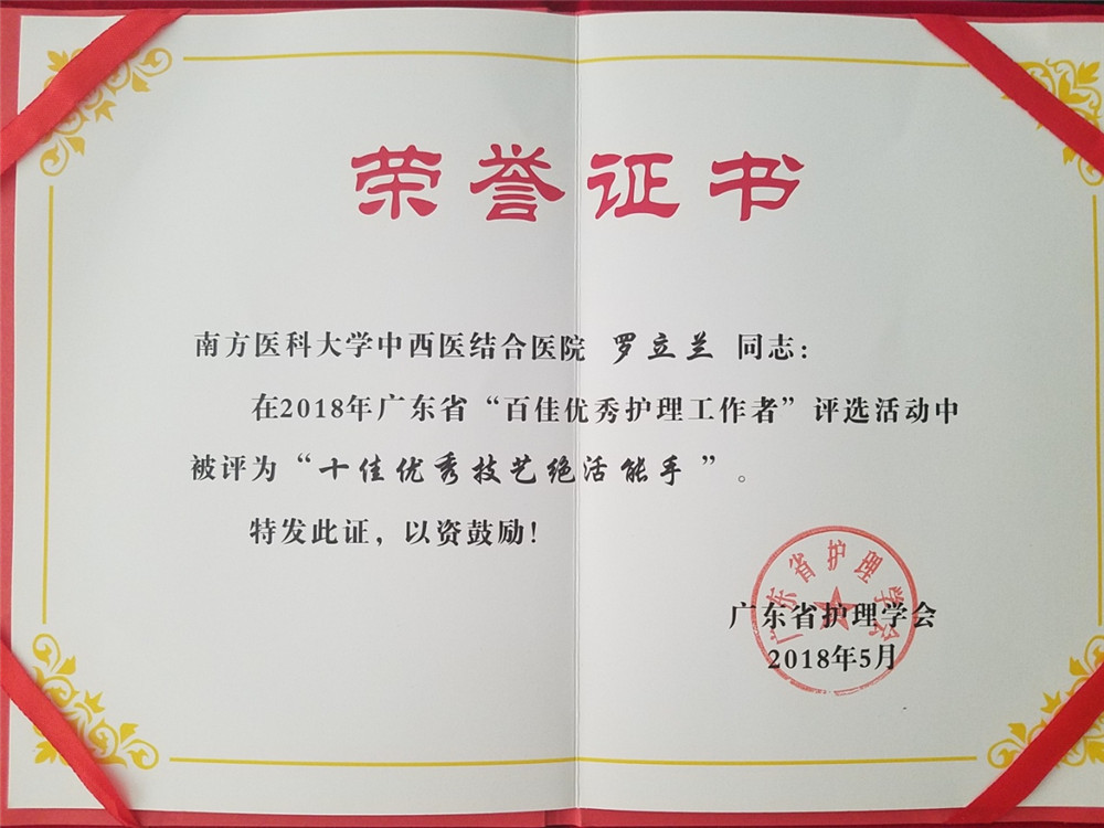 5月20日,由广东省护理学会举办的“百佳护理工作者”表彰活动评选结果揭晓,我院肾病科护理单元护士长罗立兰,荣获“十佳优秀技艺绝活能手”称号。