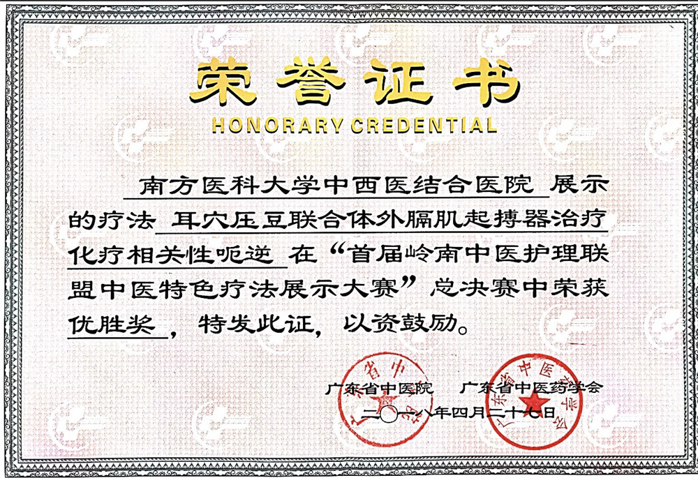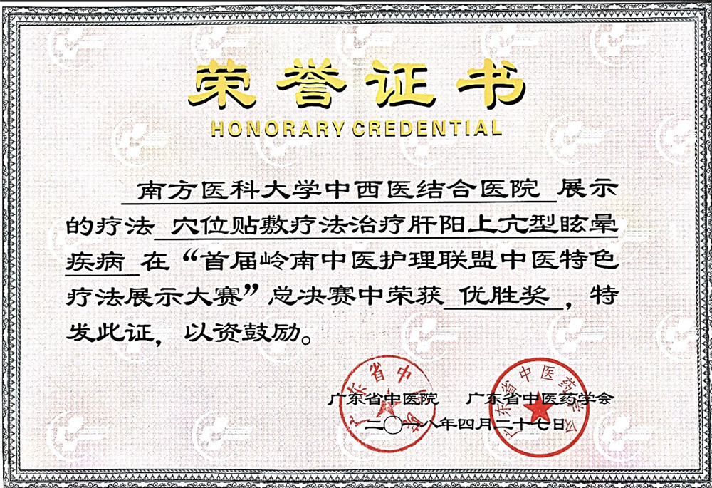在首届岭南中医护理联盟中医特色疗法展示大赛中,我院“耳穴压豆联合体外膈肌起搏器治疗化疗相关性呃逆”和“穴位贴敷疗法治疗肝阳上亢型眩晕疾病”分别获得优胜奖。