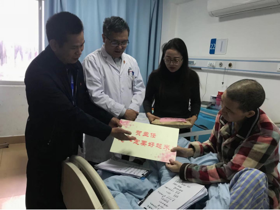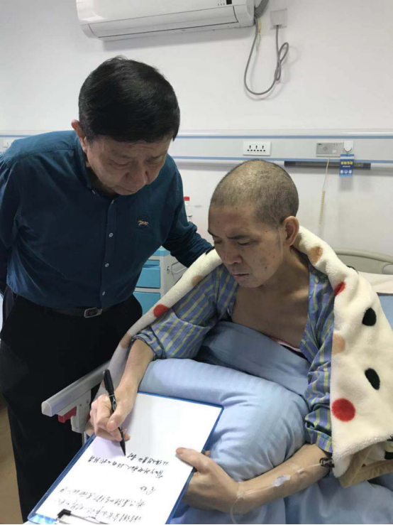 爱人者人恒爱之。贺运河主任再次住院的消息传开后,医院员工自发捐款为其减轻就医负担,医院领导十分关心贺主任,想方设计为他解决后顾之忧。省卫生健康委、省卫生政研会等相关领导前往医院慰问,省精神文明办为贺主任申请了“广东好人”基金,将30000元求助金送至贺主任手上。面对每个月50000多元一瓶需从国外自购的救命药,贺主任总觉得是给单位和家庭添了负担,一度情绪消沉,甚至想到采取极端办法彻底解脱,正在临床进行规培学习的儿子专门请了一个月假期,寸步不离地照顾父亲,陪他渡过最艰难的日子。