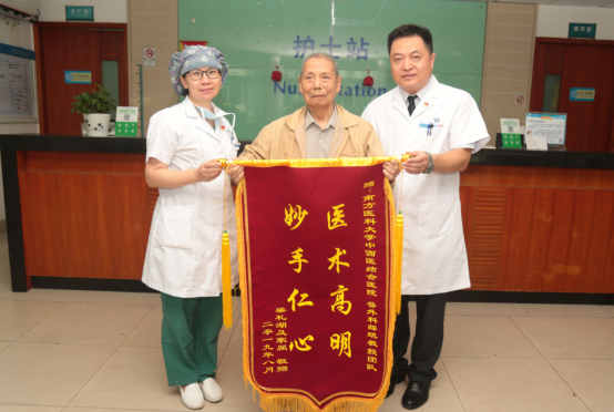 手术如期进行,在麻醉科医护人员“保驾护航”下,麻醉科宁雪主任对麻醉方法进行优化,尽量减少术中肌松药,阿片类药品的使用,术中及术后对输液液体进行加温,避免低体温,减少术后感染及心脏并发症,外科手术团队采用腹腔镜手术,克服了肿瘤较大、组织水肿及解剖变异等困难,术中由于精细的操作,几近零出血完成了这台复杂的手术,为梁爷爷的快速康复打下基础。术后采取了一系列中西医结合康复治疗,加上护理人员的精心照料,梁爷爷术后第2天肛门已排气排便,从不能进食到进食全流、半流、普食逐步过渡,饮食量逐步增加,梁爷爷慢慢可以下床自行活动,术后第5天就嚷着要出院。