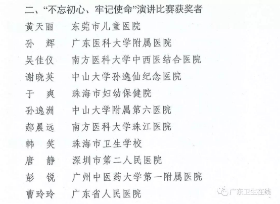 12月16日,广东医生家国情系列主题活动颁奖大会在广州珠江宾馆举行。会上颁发了第三届“广东好医生”评选、“不忘初心、牢记使命”演讲比赛、“为了百姓健康”微电影大赛、“我和我的祖国”摄影大赛四项大奖。我院吴佳仪荣获“不忘初心、牢记使命”演讲比赛二等奖,我院选送的视频《永远的初心》获得“为了人民的健康”微电影大赛二等奖。