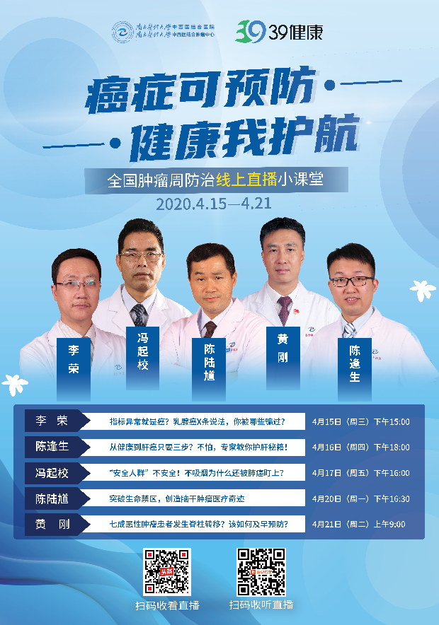 2020年4月15~21日,第26个全国肿瘤防治宣传周。为推动落实健康中国,癌症防治专项行动,提高全社会癌症防控意识,39健康联合南方医科大学中西医结合医院,推出“癌症可预防,健康我护航”的大型网络视频/音频直播节目,届时5大肿瘤专家坐镇,打响全民防癌抗癌保卫战。干货满满的癌症科学防治直播,约定您!