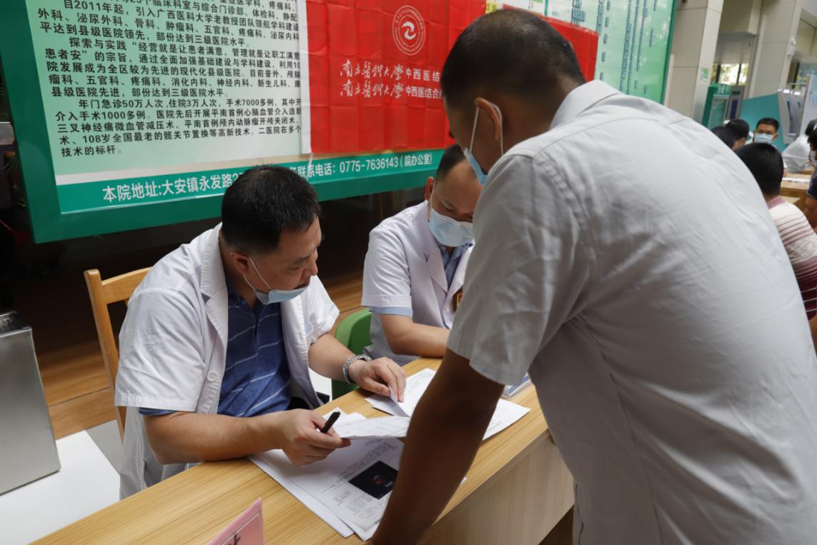 此次活动由南方医科大学中西医结合医院、平南县第二人民医院联合举办,我院派出了神经外科陈陆馗、袁淮涛、张建锋,针推康复科周国平,呼吸内科冯起校,消化内科张卫民,普通外科薛琪,泌尿外科曾京华,神经内科黎洪展等相关专业的9名专家,组成义诊专家团队为平南周边民众提供疾病诊疗服务。