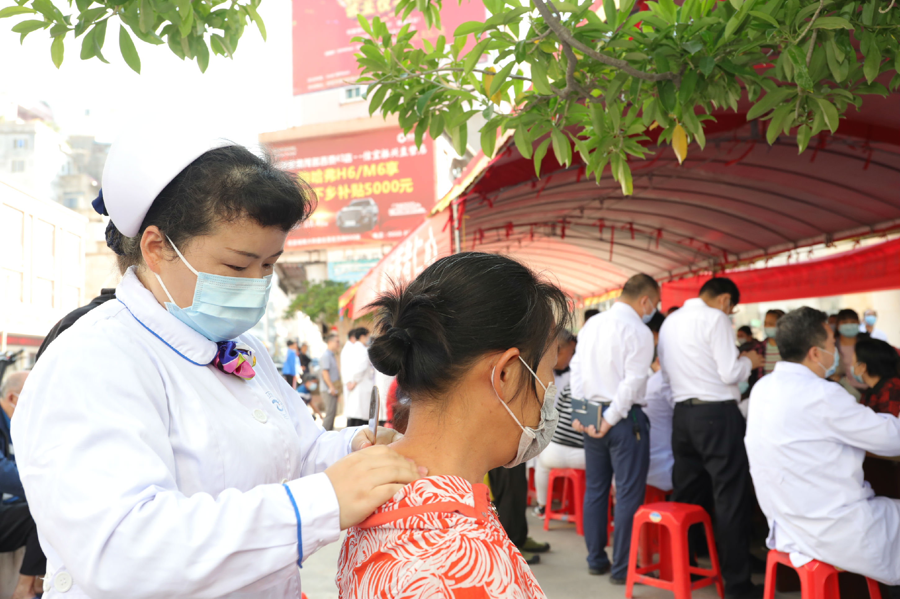 专家们为群众耐心看诊,针对常见病、多发病,以及老年病患等重点人群,给予科学指引和健康处方。义诊现场还设置了中医特色护理服务,铜砭刮痧、耳穴疗法等中医特色治疗,吸引了众多群众体验。
