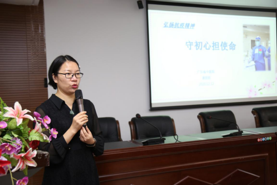 广东省中医院大学城医院皮肤风湿科护士长潘丽丽作了题为《守初心,担使命》的抗疫故事宣讲。曾经经历“非典”战疫的她,在17年后再次“请战”,忍痛留下两个孩子,剪去秀发,毅然加入广东援鄂医疗队。在面对来势汹汹的“新冠”,她在临床上运用中医特色技术,帮助患者缓解高热、咳喘等症状,效果显著。