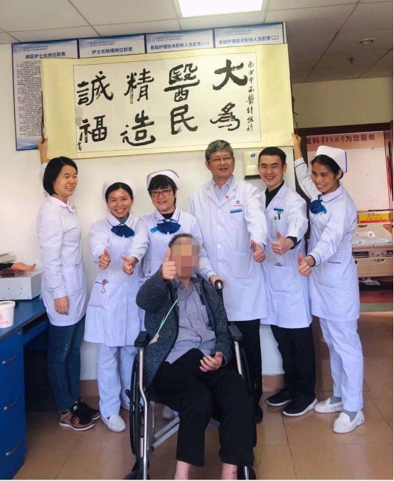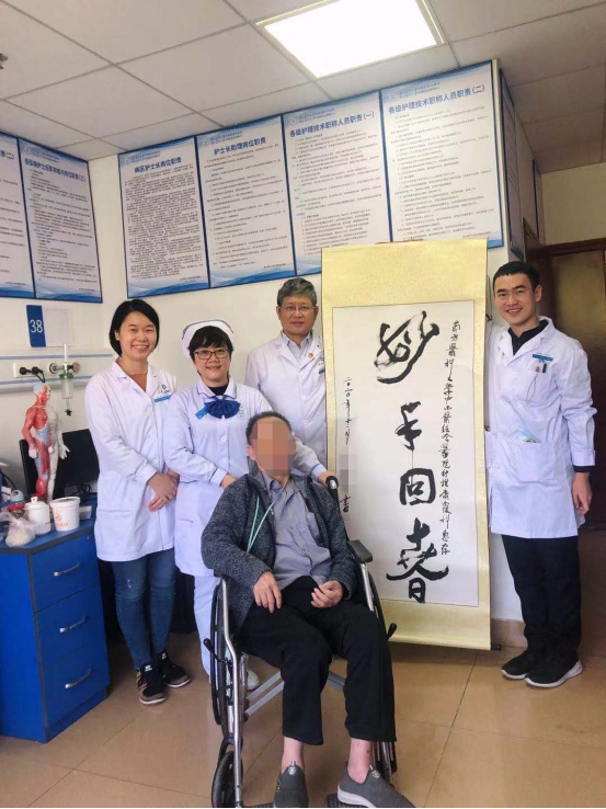 今年70岁的区叔((化名))是一名书法家,曾经获世界书画艺术名人、国际银奖艺术家等称号。因脑血管意外后遗症于2019年10月15日首次来到南方医科大学中西医结合医院针推康复科治疗。来院时左侧肢体乏力,不能翻身坐起,腰部酸软无力。住院期间,周国平主任团队精心为其制定治疗方案,进行中西医结合系统康复治疗,包括特色针法—全经针刺法治疗并配合雷火灸治疗,整体经络推拿等,周主任为患者辨证论治、处方用药,并配合偏瘫肢体训练、手工能训练及物理治疗等康复训练。主管医生陈莹博士每天精心为其诊疗,丁玲英护士长精心设计护理方案,指导良肢体摆放,预防跌倒,在全科医护人员的精心照料下,区叔病情得到好转,现在可下地拄拐行走。为了纪念这份医患携手共同康复的情谊,重新拿起了笔,书写出这两幅书法作品。