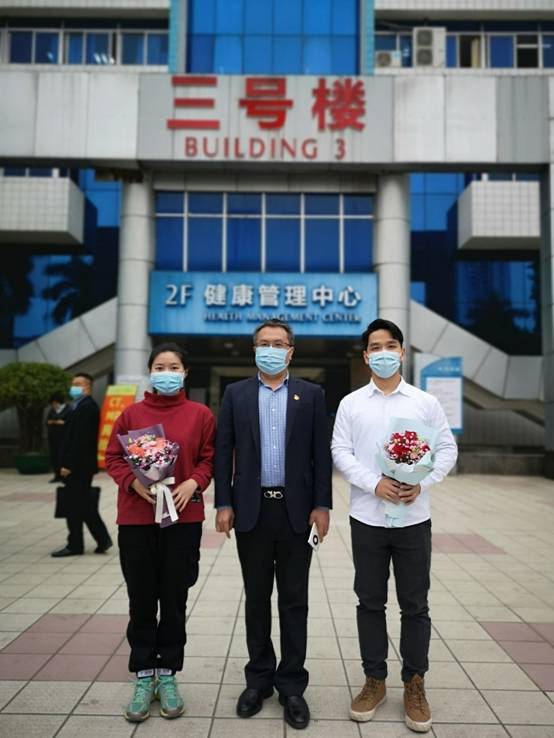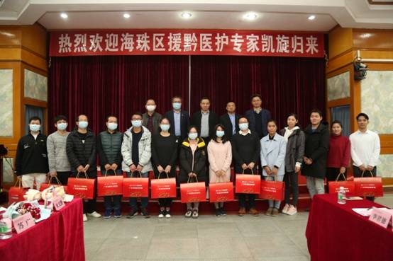 下午15时,在瓮安县卫生健康局党组副书记、副局长李君德,岚关乡人民政府副乡长兰登辉,瓮安县卫生健康局医政医管科科长刘定江的护送下,我院陈昉和苏广跟随海珠区第三批援黔医疗队顺利抵达广州。海珠区政府庄承汶副区长,广东省第二人民医院、广州市红十字会医院等有关领导和我院李爱民院长及相关科室主任和同事,早早等候在大门口,夹道欢迎援黔医疗队凯旋。现场,区领导与医务人员一一握手献花,并合影留念。