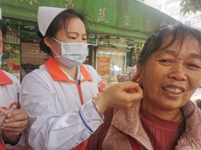 活动尾声,一位路过的阿姨注意到志愿者是来自医院时,主动上前咨询,表示自己最近时不时地睡不好、胃口不好,希望志愿者能给她一些帮助。志愿者了解情况后,热情地告诉阿姨一些日常保健知识,并就地为她进行了一次耳穴压豆,帮助阿姨缓解病情。