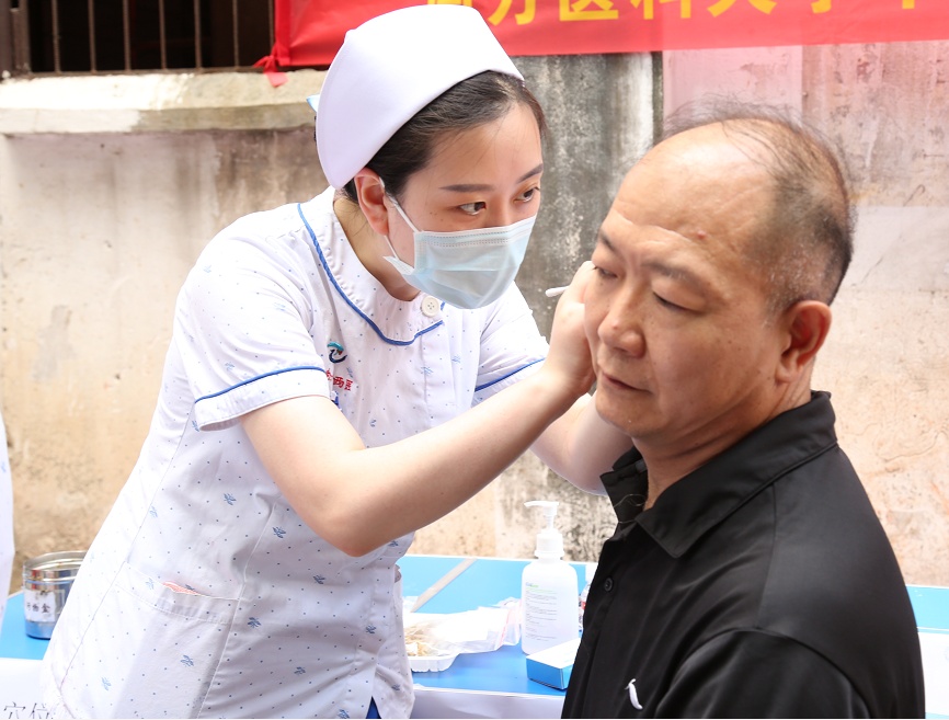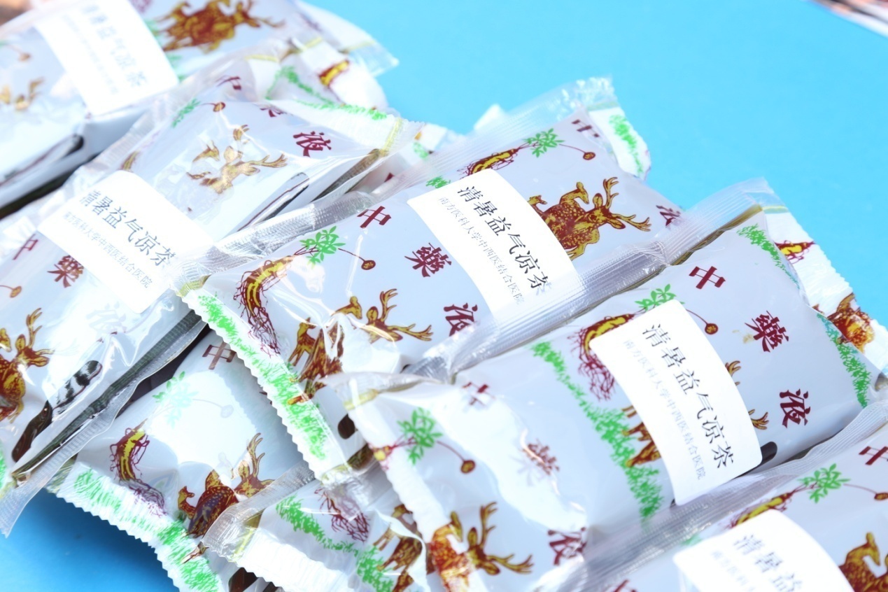 医院医护人员为居民提供疾病咨询和用药指导,测血糖、量血压及耳穴压豆、刮痧、艾灸等中医护理操作。考虑到近期广州天气炎热,免费将医院自制的清暑益气凉茶300包发给居民。