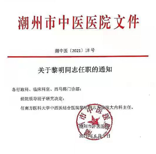 经潮州市中医医院领导班子研究决定,黎明任潮州市中医医院大内科主任。黎医生将结合党史学习教育,把“我为群众办实事”实践活动融入帮扶工作,严格按照“育人才、强专科、提能力、创品牌”的帮扶目标,加强科室管理、学科建设、人才培养、技术引进,将南方医科大学中西医结合医院的管理经验和先进技术助力潮州市中医医院发展,为当地人民提供满意的中医药服务。
