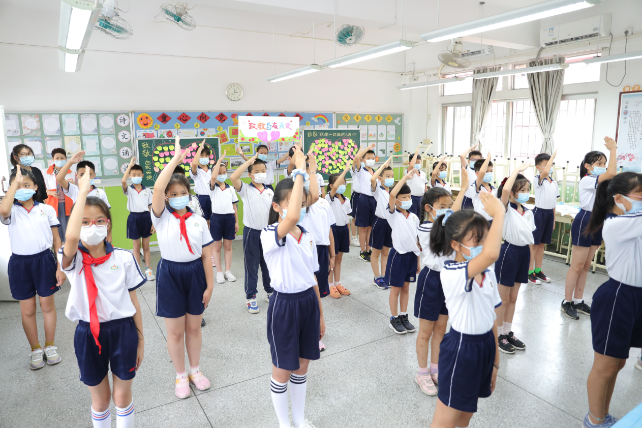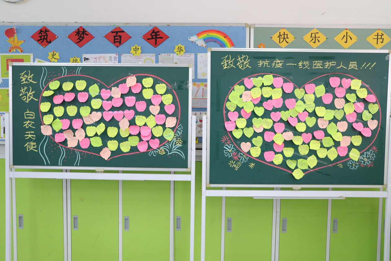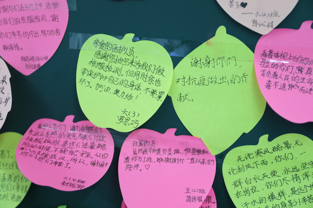 18名护理人员中,大多数当了妈妈,他们的孩子也在其中上小学、幼儿园。当看到赤岗东小学的孩子们用手语表演 “听我说谢谢你”以及精心准备的留言 “感恩墙”,“妈妈”采样团忍不住眼眶湿润。“虽然我不知道你是谁,但我知道你是在为中国人民的健康奋战”……一句句暖心的话语让人备感温暖。学生们还将他们的祝福创作成一幅幅感人的图画,其中有一幅“白衣天使”漫画特别醒目,是两位六年级的小朋友合作而成,问他们为什么会有这么新奇的创意,他们说自己的爸爸是军人,平时看起来很安静,但一旦有紧急任务就冲锋陷阵,很勇敢的!他们觉得医护工作人员也一样,在疫情面前就是救死扶伤的天使,保护人们健康,很伟大。