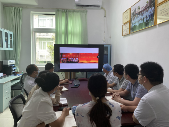 会议伊始,医院组织全体党员观看《医心向党》微视频,2021年,医院党委组织优秀党员干部忆党龄、守初心,坚定共产主义的信仰,将对党的深情祝语转化为铿锵有力的誓言和脚踏实地的行动,传承“雷锋”式的好医生——贺运河精神,将“爱党爱国爱院爱岗”落实在具体工作中,坚定笃行,为人民护健康,为党旗添光彩。