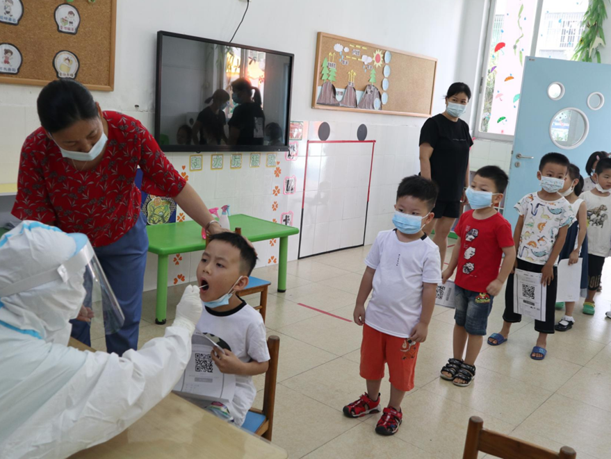 为保证疫情期间不聚集,护理人员指导幼儿园采取错峰分组返校的办法,半个小时一个年级组,先后返园。在工作人员和老师指引下排队、扫码、采样,孩子们个个神采奕奕,淡定自如,自觉排队测温扫码,积极配合,11点左右,顺利的完成了315名师生的核酸采样工作。