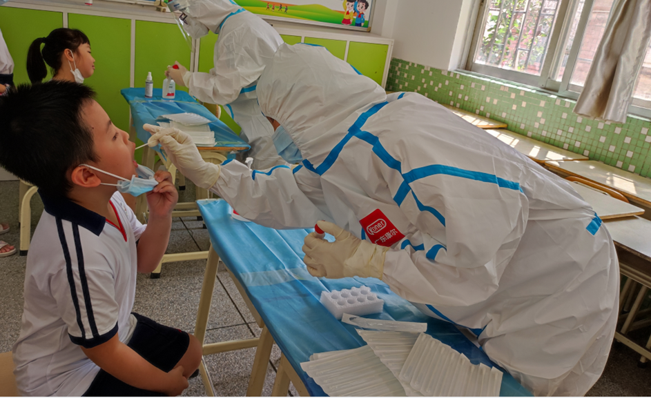 “张开嘴,啊,好嘞”护理人员一边正确的引导孩子,一边迅速的完成咽拭子的采集,整个过程,不到20秒,在护理人员熟练的操作下,仅用1.5个小时,完成了700余名师生的核酸采样工作。