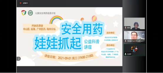 9月1日,由药品安全合作联盟(PSM)、北京药盾公益基金会主办,广东省药学会、药品安全合作联盟(广东)、南方医科大学中西医结合医院药学部承办的“安全用药 娃娃抓起”2021儿童安全用药公益科普线上讲座广东省站正式开讲。上海市儿童医院药学部李志玲副主任、中部战区总医院药学部苏晓丹药师分别进行授课,广东省妇幼保健院王穗琼主任、中山大学附属第三医院粤东医院麦海燕副主任、中国人民解放军南部战区总医院彭海莹副主任等答疑嘉宾参会。讲座由中山大学孙逸仙纪念医院邱凯锋主任主持,幼儿园、小学、社区等机构受邀的家长及PSM志愿者观看了此次网络直播讲座。