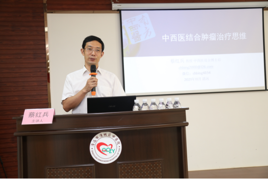 ▲医务科蔡红兵科长授课《中西医结合肿瘤治疗思维》