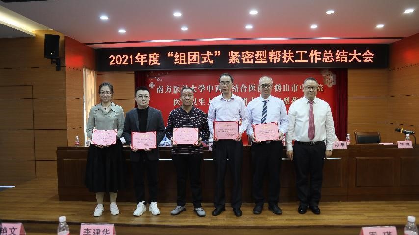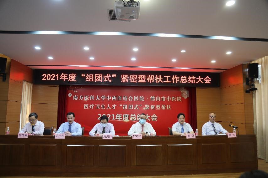2019年底,根据中共广东省委组织部、广东省卫生健康委员会“组团式”紧密型帮扶工作统一安排,我院对鹤山市中医院开展帮扶,今年是第三个年头。2021年,医院选派了钟东、田新发、陈杰彬、翁勰、蔡佳辰常驻鹤山市中医院,根据广东省卫生健康委 中共广东省委组织部《关于印发广东省医疗卫生人才“组团式”紧密型帮扶工作方案的通知》(粤卫办人函〔2022〕6号)文件精神,从2022至2025年,我院将再进一步帮扶鹤山市中医院,2022年我院派出消化内科钟东、肿瘤四科(肝胆胰肿瘤科/肝病科)翁勰、重症医学科蔡佳辰、外二科(甲乳血管外科/ 肛肠科)唐巍、肾病科李成杰作为第三批帮扶队队员参与帮扶工作,钟东任帮扶队长。