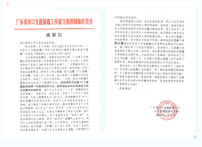 近日,我校中西医结合医院收到广东省对口支援新疆工作前方指挥部临时党委的感谢信。