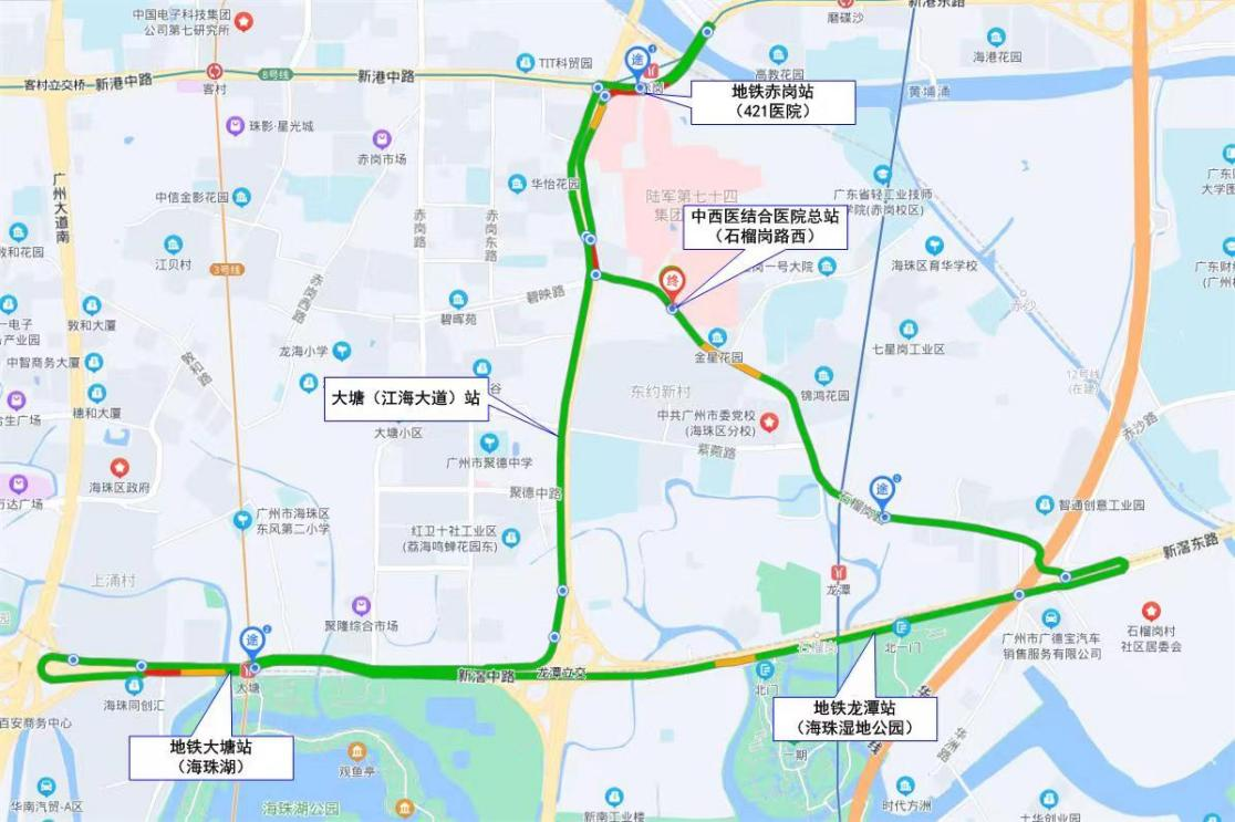 专线途经石榴岗路、江海大道中、新港东路、江海大道中、新滘中路、石榴岗路等路段,线路站点设置为:南医大中西医总站(石榴岗路西)—地铁8号线赤岗站(421医院)—大塘(江海大道)—地铁3号线大塘站(海珠湖)—地铁18号线龙潭站(海珠湿地公园)—南医大中西医总站(石榴岗路西)共五个站点,全程约35分钟,服务时间为周一至周日07:00-10:30;15:30-19:00,全天发班间隔不大于20分钟。